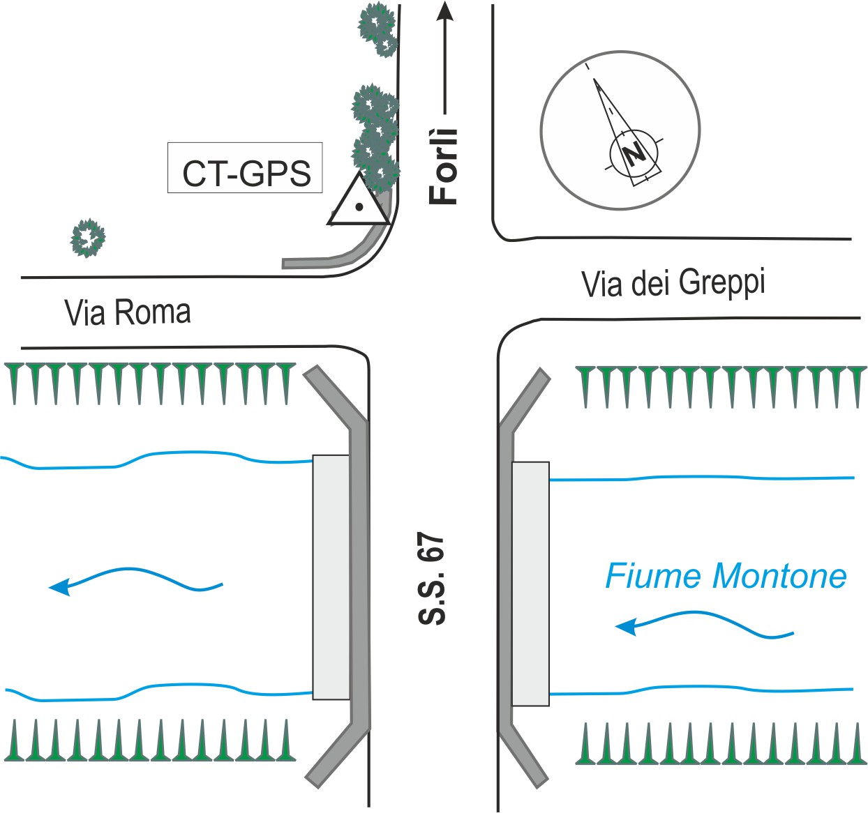 | Materializzazione | Centrino metallico infisso sulla fondazione esterna del muretto di sostegno del marciapiede. |