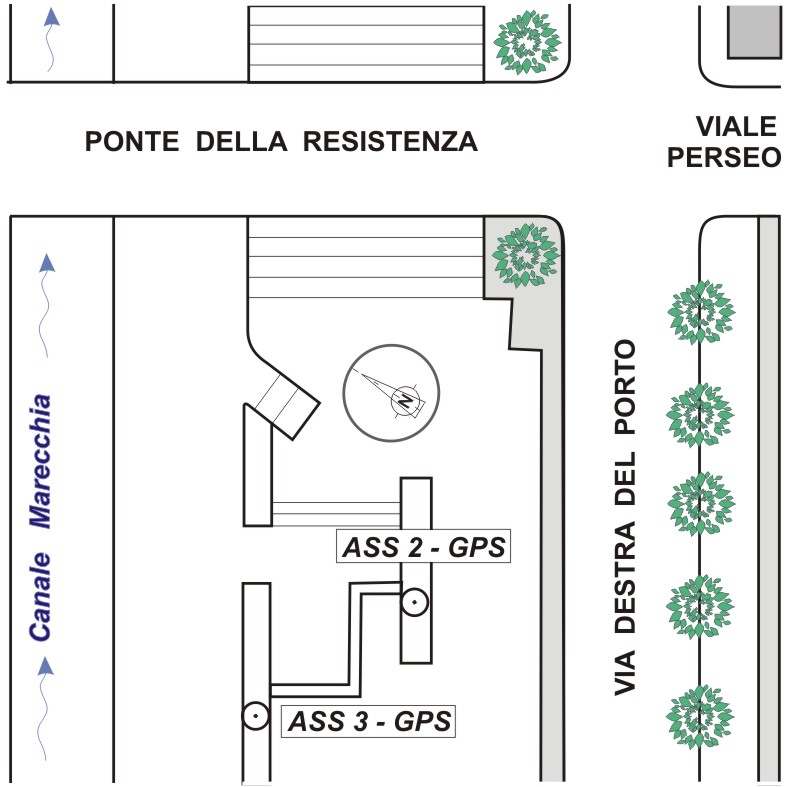 Centrino in acciaio inox del tipo "GPS D" infisso sul muro in pietra della riva destra del canale Marecchia, a fianco della rampa d'accesso al canale.