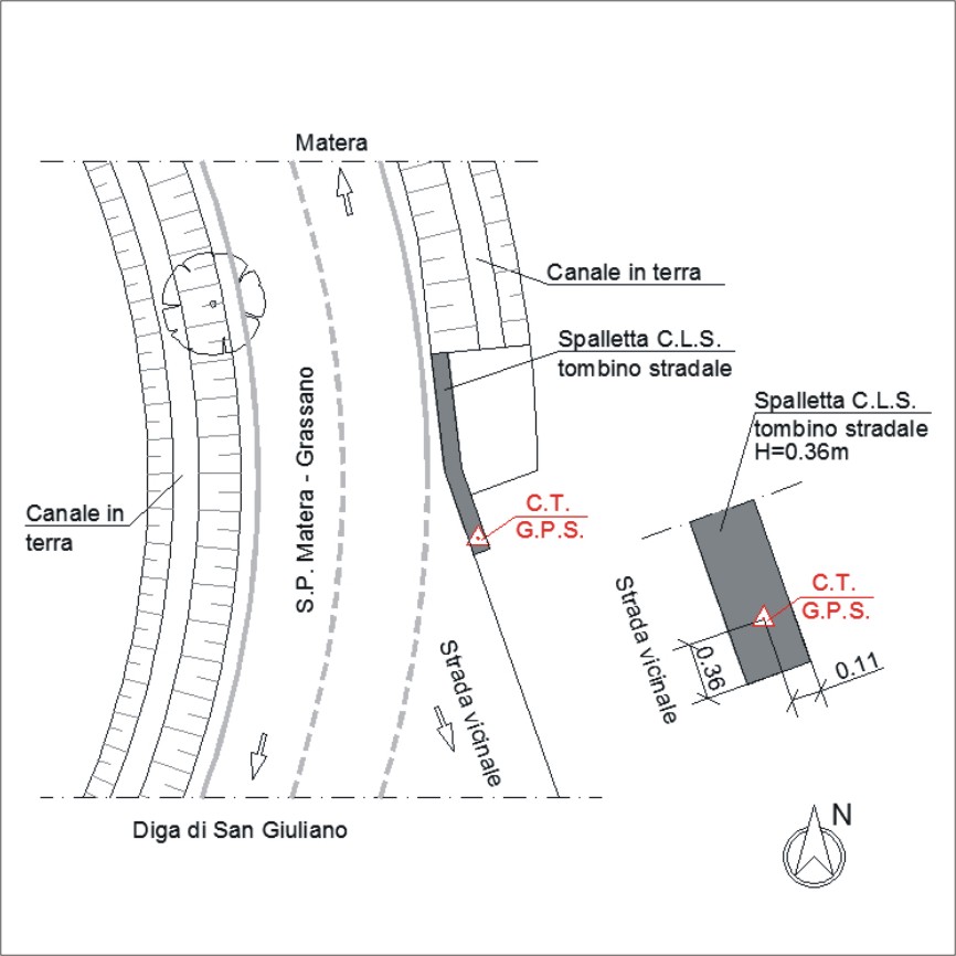 | materializzazione | Centrino orizzontale di tipo chiodo con rondella ARPAB Regione Basilicata infisso sulla sommità di una spalletta tombino stradale. |