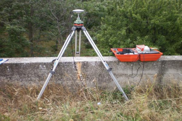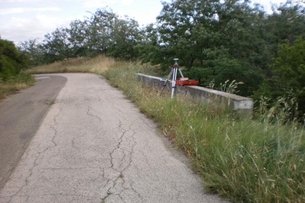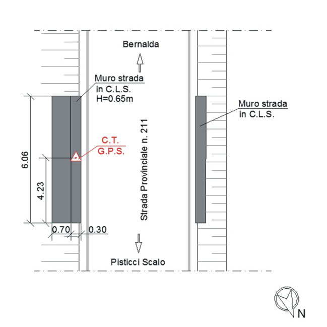 Centrino orizzontale di tipo chiodo con rondella ARPAB Regione Basilicata infisso sulla sommità del muro in C.L.S. strada.