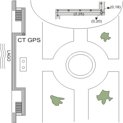 Centrino universale GPS in acciaio inox infisso sul cordolo in pietra in corrispondenza dello spigolo della scaletta di discesa al lago a destra della fontana dei giardini.