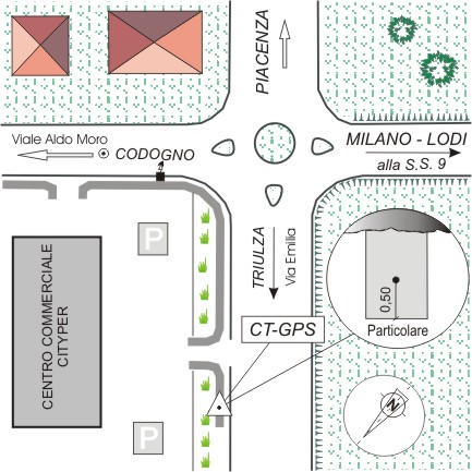 Centrino universale GPS in acciaio inox infisso sulla sommità del muretto d'ala d'accesso al Centro Commerciale, lato sinistro entrando.