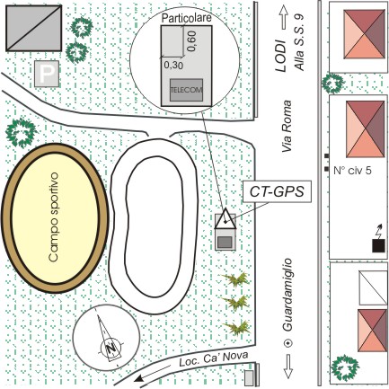| materializzazione | Centrino universale GPS in acciaio inox infisso nel lato a nord di un pozzetto Telecom tra la sede stradale e una pista asfaltata per atletica leggera annessa al Centro Sportivo Comunale di Guardamiglio. |