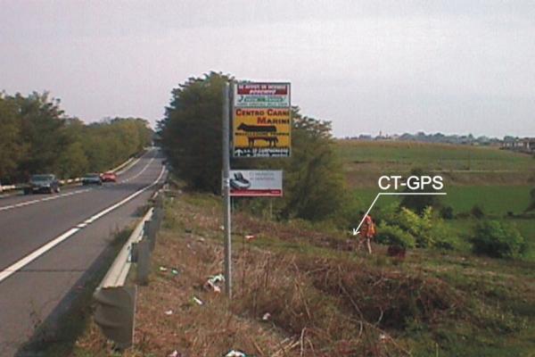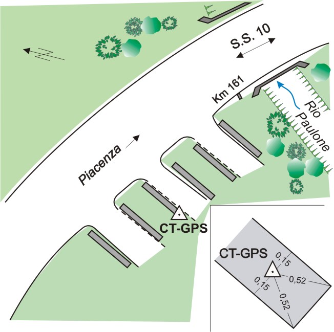 | materializzazione | Centrino universale GPS in acciaio inox infisso sulla sommità del muro di contenimento est della seconda stradina sterrata uscente dalla Statale, sulla destra andando verso Piacenza. |