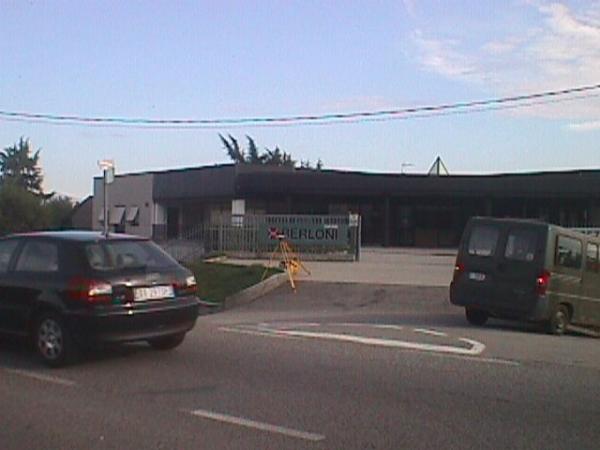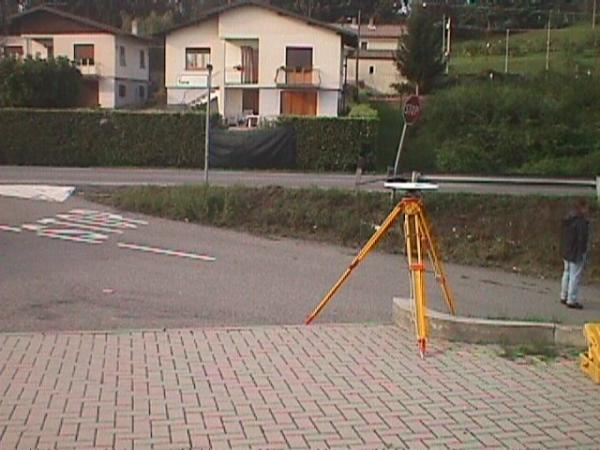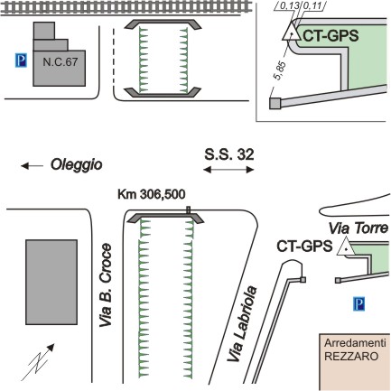 Centrino universale GPS in acciaio inox infisso sulla sommità del muretto in cemento armato a bordo dell'aiuola a sinistra dell'ingresso al negozio d'arredamenti.