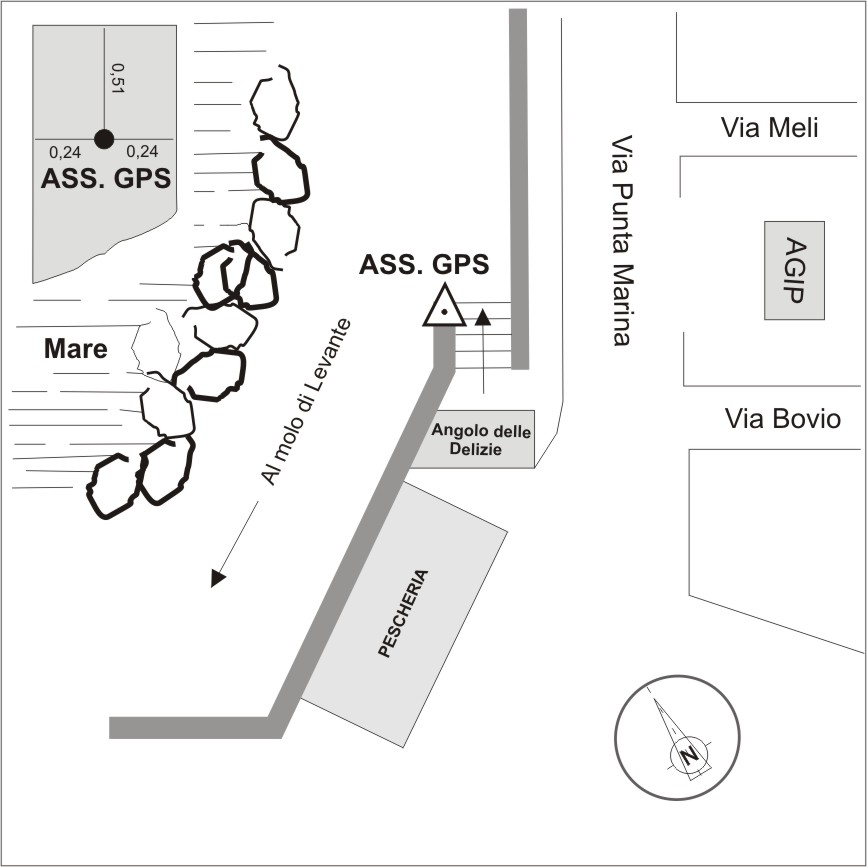 Centrino in acciaio inox del tipo "GPS D" infisso alla sommità e prossimo alla testa del muro di contenimento in calcestruzzo armato delle scale di accesso alla barriera frangi-flutti di Via Punta Marina.