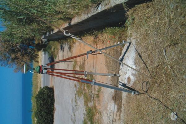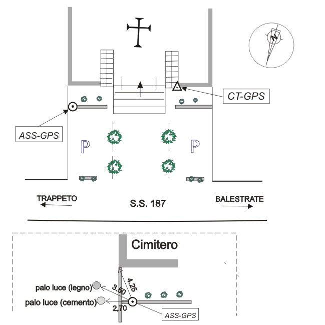 Centrino in acciaio inox del tipo "GPS D" infisso su cordolo in cemento in prossimità dello spigolo nord del cimitero di Trappeto.