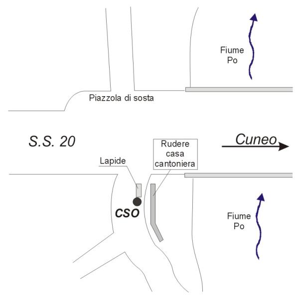 [{"simbolo_contrassegno":"B1","materializzazione":"(CSO) Bullone in ghisa infisso sul lato posteriore rispetto alla S.S. n\u00b020 di una lapide commemorativa al km 14+100 della S.S. n\u00b020"}]