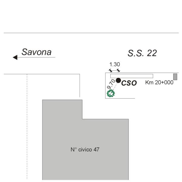 | Contrassegni | [{"simbolo_contrassegno":"B1","materializzazione":"(CSO) Bullone in ghisa cementato a m 1.39 dallo spigolo sinistro di un muro di sostegno sulla S.S. n\u00b022 alla prog. Km 19+950 di fronte al fabbricato civico n\u00b047"}] |