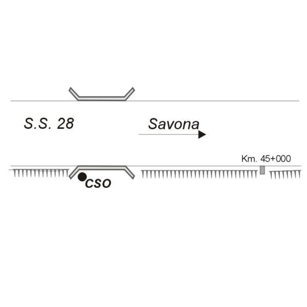 | Contrassegni | [{"simbolo_contrassegno":"B1","materializzazione":"(CSO) Bullone in ghisa cementato sulla spalletta destra lato destro in direzione Savona del ponticello in mattoni al Km 44+950 della S.S. n\u00b028"}] |