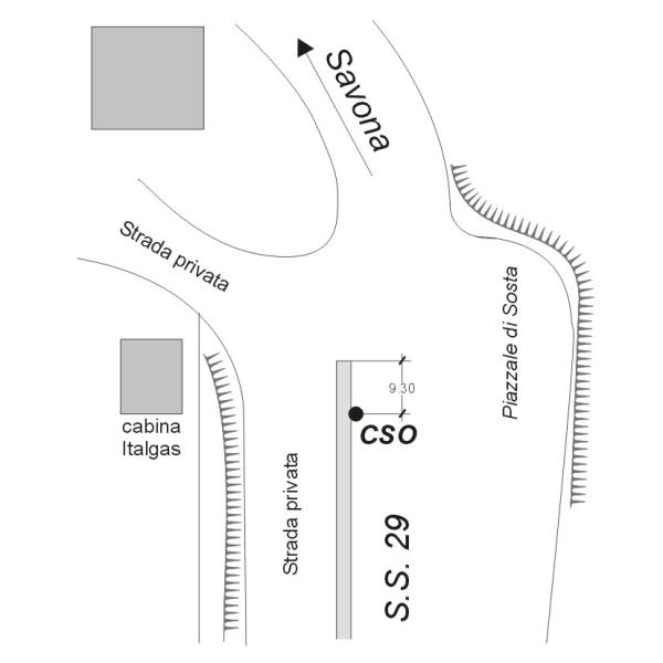 | Contrassegni | [{"simbolo_contrassegno":"B1","materializzazione":"(CSO) Bullone in ghisa cementato su muro di contenimento di una strada privata lato sinistro direzione Savona a m 9.30 dallo spigolo destro"}] |