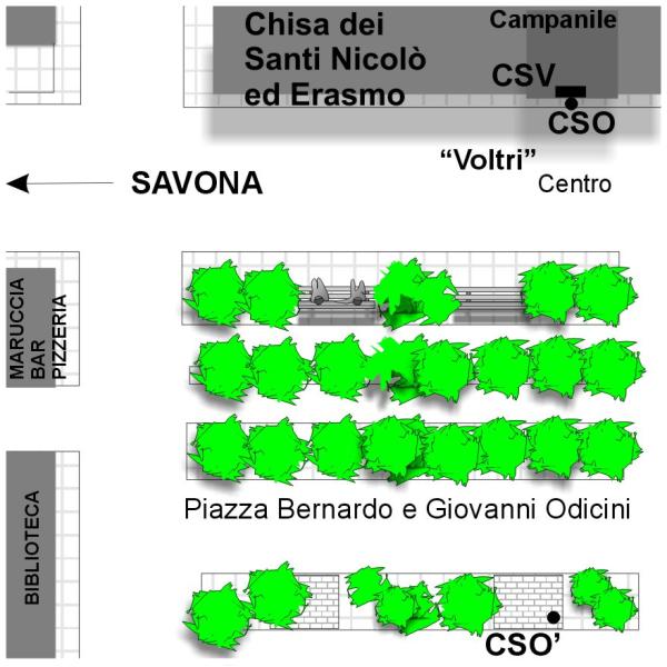 [{"simbolo_contrassegno":"B1","materializzazione":"(CSO) Bullone infisso sulla facciata del campanile della Chiesa dei Santi Nicol\u00f2 ed Erasmo."},{"simbolo_contrassegno":"V3","materializzazione":"(CSV) Piastrina infissa sulla facciata del campanile, in corrispondenza del cso."},{"simbolo_contrassegno":"B4","materializzazione":"(CSO') Bulloncino tipo GPS infisso sul lastricato del marciapiede in Piazza Bernardo e Giovanni Odicini, come da schizzo monografico."}]