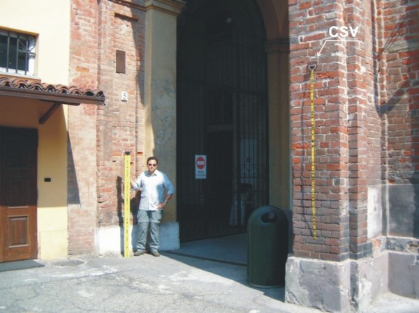 [{"simbolo_contrassegno":"P2","materializzazione":"(CSO) – Pozzetto interrato alla base del primo pilastro da sinistra del porticato del Municipio, nell'angolo formato con l'edificio della biblioteca."},{"simbolo_contrassegno":"V1","materializzazione":"(CSV) – Mensola infissa sul secondo pilastro del porticato del Comune."}]