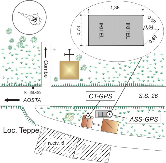 | materializzazione | Centrino in acciaio inox del tipo "GPS D" infisso su una piattaforma in cemento che circonda due tombini in ferro della Società IRITEL, in prossimità del CT-GPS, lato sinistro della S.S. 26 direzione Aosta. |