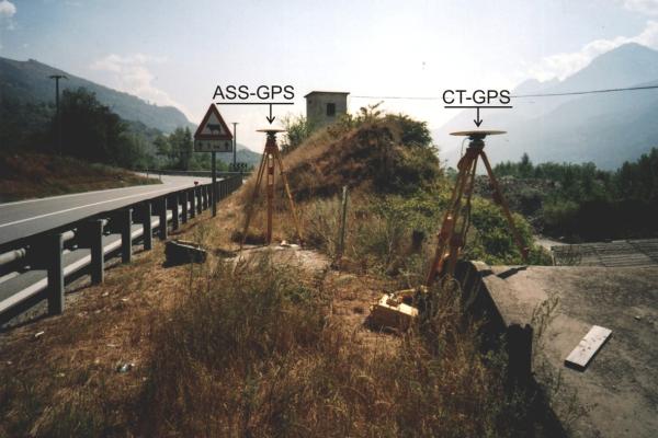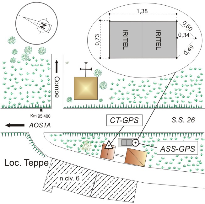 | materializzazione | Centrino GPS da livellazione in acciaio inox infisso sul cordolo del colmo tetto di un rimessaggio posto a lato della S.S. 26. |