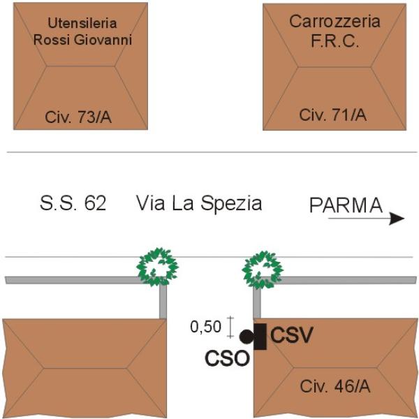 | Contrassegni | [{"simbolo_contrassegno":"B1","materializzazione":"(CSO) Bullone stabilizzato nella facciata, lato ingresso della pallazzina degli uffici, spigolo su via la spezia n. 46\/A ."},{"simbolo_contrassegno":"V1","materializzazione":"(CSV) Mensola stabilizzata nella facciata suddetta in corrispondenza del CSO."}] |