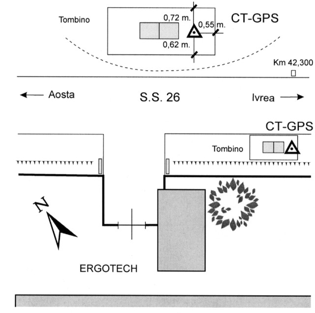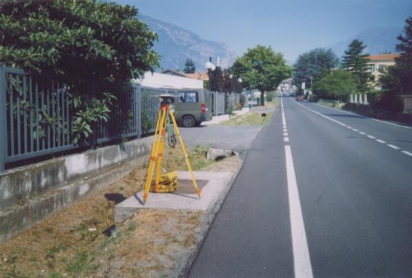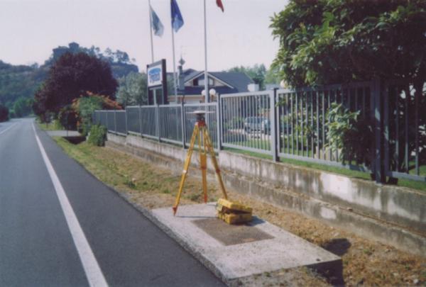 Centrino universale GPS in accioaio inox, infisso alla sommità di tombino in cemento, a margine della strada.