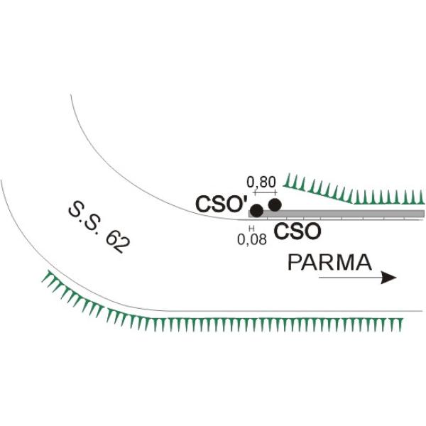 | Contrassegni | [{"simbolo_contrassegno":"B1","materializzazione":"(CSO) Bullone infisso nel muro in CLS lato sinistro della strada in direzione Parma a 0,80m dallo spigolo destro."},{"simbolo_contrassegno":"B4","materializzazione":"(CSO') Centrino inox tipo GPS cementato sul muro in CLS a sinistra della strada indirezione Parma a 0,08 m dallo spigolo destro."}] |