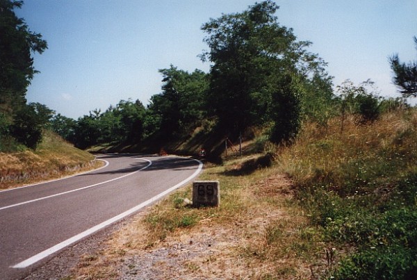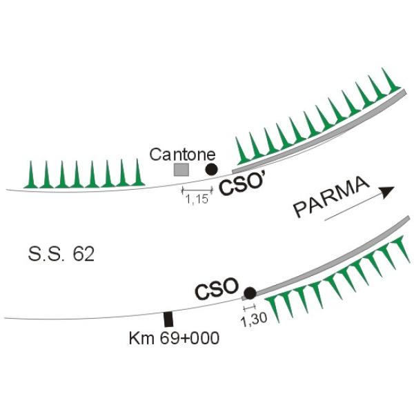 | Contrassegni | [{"simbolo_contrassegno":"B2","materializzazione":"(CSO) Chiodo tipo anonimo cementato sul muretto a destra della strada in dir. Parma."},{"simbolo_contrassegno":"P3","materializzazione":"ozzetto posto sul margine sinistro della statale in direzione Parma presso la testata del muretto di sostegno.A metri 1,15 dal cantone di fronte alla pietra chilometrica del Km69."}] |