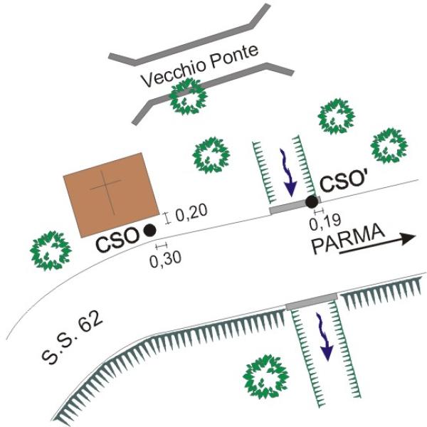 | Contrassegni | [{"simbolo_contrassegno":"P5","materializzazione":"(CSO) Pozzetto murato alla base del lato verso strada, allo spigolo destro protetto da tubo in plastica e chiusino di ghisa posto al livello del suolo."},{"simbolo_contrassegno":"B4","materializzazione":"(CSO') Chiodo inox tipo GPS con semisfera cementato sul muretto di spalla del ponticello."}] |