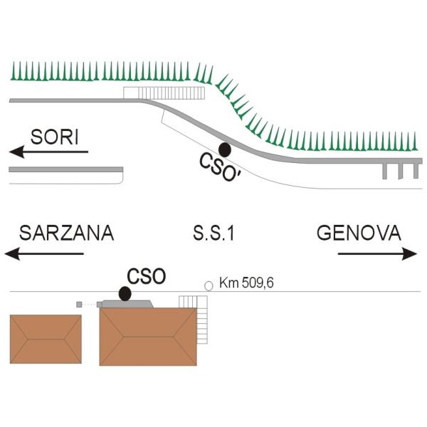 | Contrassegni | [{"simbolo_contrassegno":"B1","materializzazione":"(CSO) Bullone infisso nel muro di sostegno di fronte al cso' a destra dell'ingresso al bar \"il baretto\"."},{"simbolo_contrassegno":"B4","materializzazione":"(CSO') Centrino inox tipo GPS con semisfera cementato sul marciapiede in corrispondenza del bivio per Sori al km 509+600."}] |