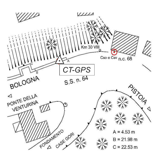 | Materializzazione | Centrino metallico infisso su muretto in cemento sul lato nord della S.S. 64, al km 30,825, in località Dogana a Ponte della Venturina in Provincia di Pistoia. |