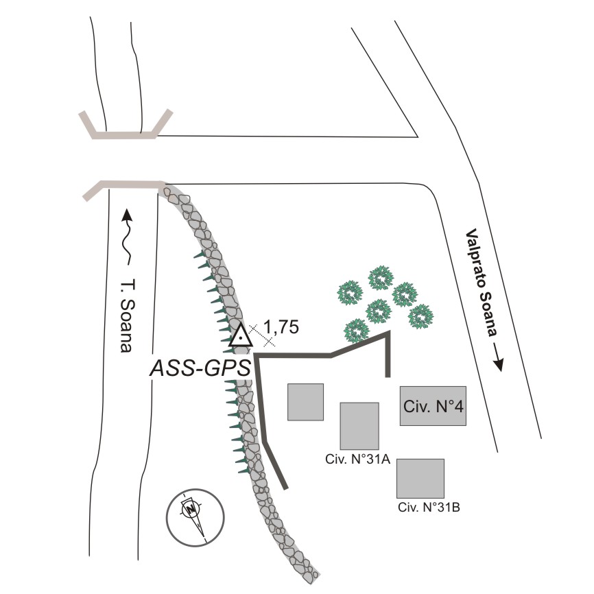 | materializzazione | Centrino in acciaio inox del tipo "GPS D" infisso alla sommità dell'argine destro in cemento e pietra, all'altezza dello spigolo sud del muro di cinta della proprietà del civico n°31a in località Bordone. |