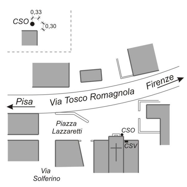 | Contrassegni | [{"simbolo_contrassegno":"P2","materializzazione":"(CSO) Chiusino in ghisa di II\u00b0 Categoria posto alla base della facciata presso lo spigolo sinistro"},{"simbolo_contrassegno":"V1","materializzazione":"(CSV) Mensola infissa nella facciata della casa di sinistra attigua alla Chiesa, a destra del portone"}] |