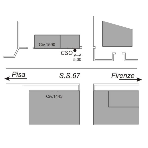 [{"simbolo_contrassegno":"B1","materializzazione":"(CSO) Bullone infisso nella facciata lato Strada Statale del civico n. 1586 a destra della porta di ingresso, a 5 m dallo spigolo destro"}]