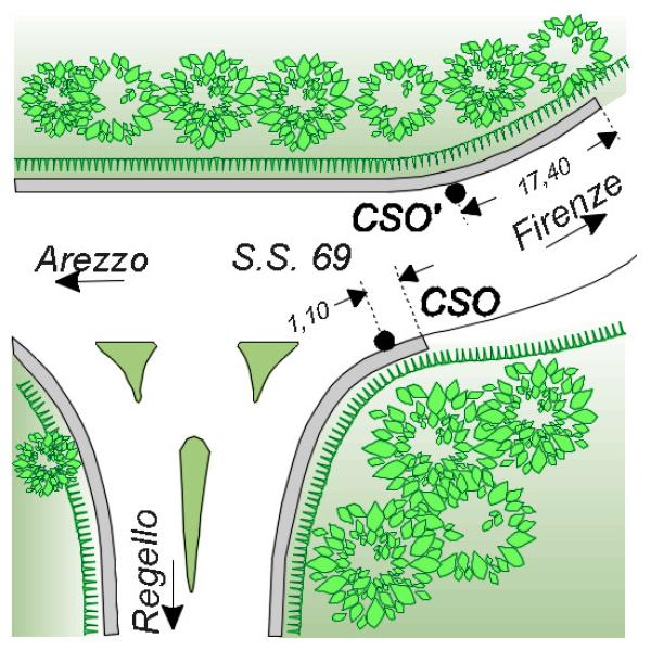 | Contrassegni | [{"simbolo_contrassegno":"B1","materializzazione":"(CSO) Bullone infisso a m 1,10 dalla testa del muro di sostegno in c.a. nello svincolo per Reggello lato Firenze."},{"simbolo_contrassegno":"B4","materializzazione":"(CSO') Centrino universale infisso nel muro di sostegno in c.a. sul lato sinistro della S.S. 69 procedendo verso Firenze in prossimit\u00e0 dello svincolo per Reggelo."}] |