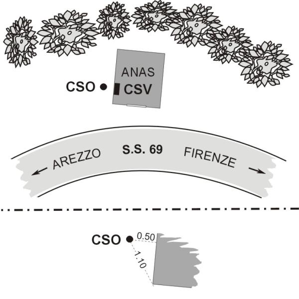 | Contrassegni | [{"simbolo_contrassegno":"P3","materializzazione":"(CSO) Chiusino alla base della parete laterale sinistra del magazzino ANAS"},{"simbolo_contrassegno":"V1","materializzazione":"(CSV) Mensola infissa sulla parete di fianco sinistra del magazzino ANAS, in corrispondenza del CSO"}] |