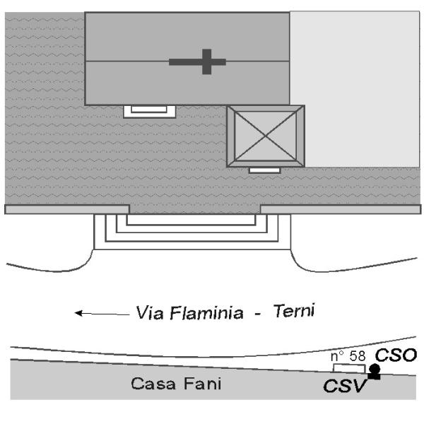 [{"simbolo_contrassegno":"P2","materializzazione":"(CSO) Alla base del muro, lato strada, a sinistra della porta d'ingresso"},{"simbolo_contrassegno":"V1","materializzazione":"(CSV) Mensola sul muro suddetto, in corrispondenza del CSO"}]
