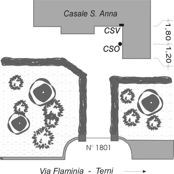 | Contrassegni | [{"simbolo_contrassegno":"B1","materializzazione":"(CSO) Alla base del muro di sinistra della nuova ala, fronte verso il viale d'accesso"},{"simbolo_contrassegno":"V1","materializzazione":"(CSV) Mensola sul muro a destra dell'ingresso del casale, in angolo con il muro della nuova ala, semi-annegato nell'intonaco di quest'ultimo, ma misurabile"}] |