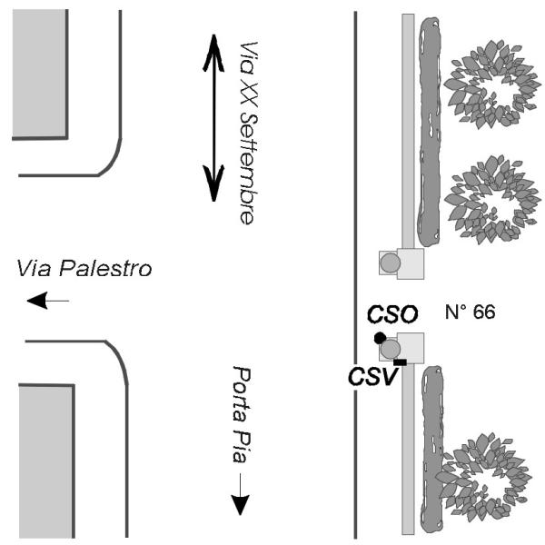 | Contrassegni | [{"simbolo_contrassegno":"B3","materializzazione":"(CSO) Materializzato dal Catasto sul basamento della colonna destra del portale in Via XX Settembre N\u00b066, di fronte a Via Palestro"},{"simbolo_contrassegno":"V5","materializzazione":"(CSV) Materializzato dal Catasto sulla facciata laterale del pilastro stesso, presso il muretto di cinta del parco"}] |