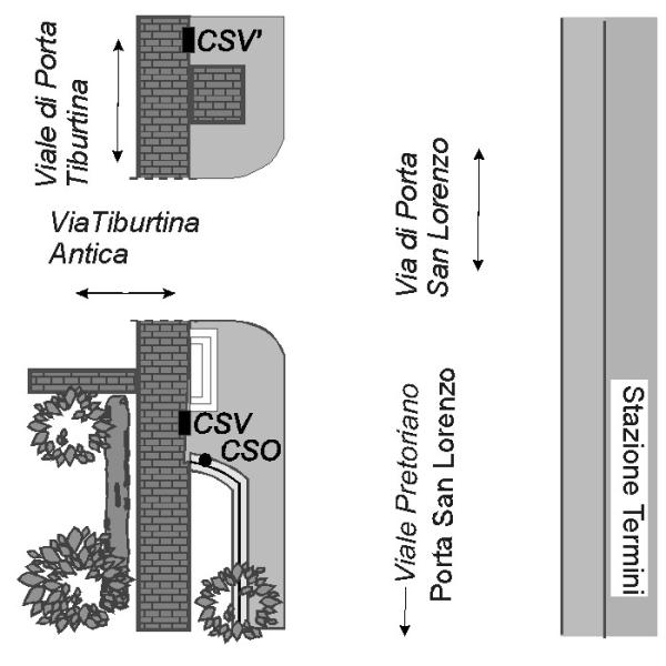 | Contrassegni | [{"simbolo_contrassegno":"B3","materializzazione":"(CSO) A sinistra dell'ultimo varco nelle mura, proveniendo da Porta Maggiore e prima di Porta S. Lorenzo, a 50 cm dal muro, sulla pietra di copertura del muricciolo che sostiene la cancellata di recinto ai ruderi"},{"simbolo_contrassegno":"V4","materializzazione":"(CSV) Piastrina della \"Livellazione della Maggiore Estensione del Piano Regolatore di Roma\", cementato sulle mura, a met\u00e0 fra il suindicato varco e la cancellata"},{"simbolo_contrassegno":"V5","materializzazione":"(CSV') ( NON MISURATA ) Piastrina di marmo, indicatrice del livello di una piena, sulle mura a destra del medesimo varco"}] |