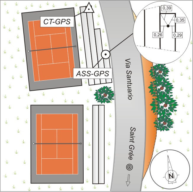| Materializzazione | Centrino in bronzo del Catasto "Punto Fiduciale GPS", infisso sullo spigolo più alto delle gradinate del campo da tennis, a margine con la strada asfaltata. |