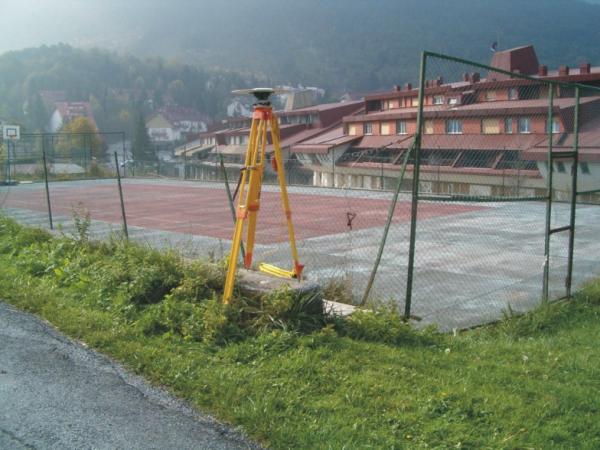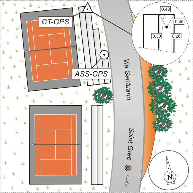 Centrino in acciaio inox della "Regione Piemonte" riportante il numero "227120/1", infisso sullo spigolo più a nord e più in alto, delle gradinate del campo da tennis.