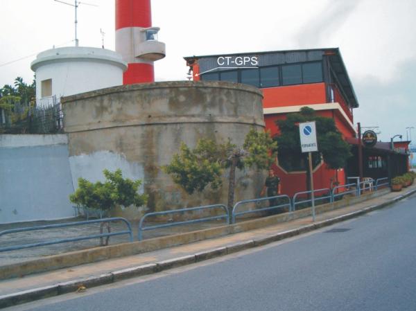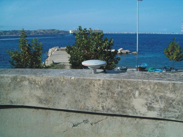 Bullone avvitato su contrassegno orizzontale con filettatura 5/8, cementato alla sommità del parapetto del muraglione conico di base al Faro Rosso. Il punto parte del poligono materializzato dall'IGM per il "Controllo Geodetico dello Stretto di Messina" denominato "Calabria II".