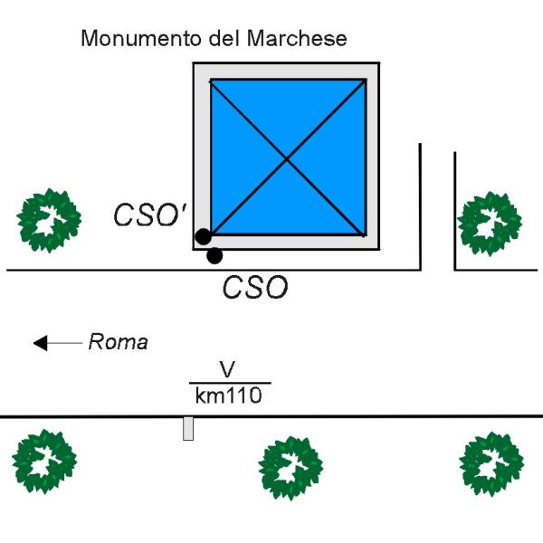 [{"simbolo_contrassegno":"P5","materializzazione":"(CSO) Pozzetto posto alla base della facciata lato strada del monumento, in prossimit\u00e0 dello spigolo sinistro."},{"simbolo_contrassegno":"B3","materializzazione":"(CSO') Cerchio inciso sullo zoccolo in corrispondenza dello spigolo sinistro del lato rivolto verso strada."}]