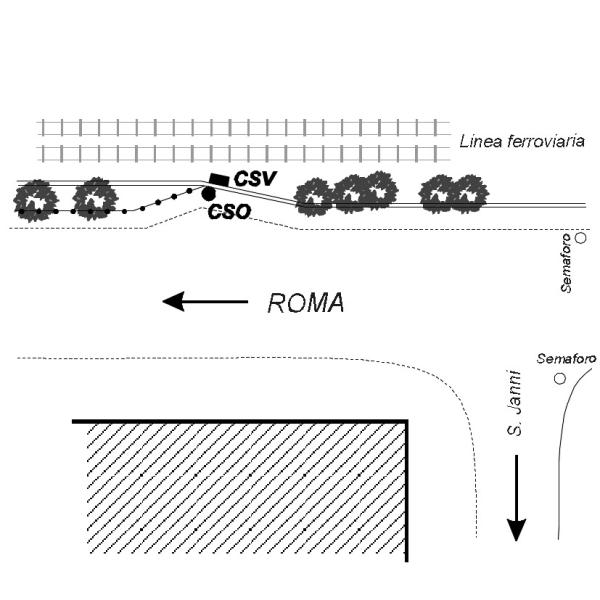 | Contrassegni | [{"simbolo_contrassegno":"B1","materializzazione":"(CSO) Bullone posto sul muro in cemento armato a recinzione della linea ferroviaria."},{"simbolo_contrassegno":"V1","materializzazione":"(CSV) Mensola fissata sul muro in cemento armato a recinzione della linea ferroviaria, in corrispondenza del CSO."}] |
