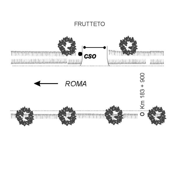 [{"simbolo_contrassegno":"B1","materializzazione":"(CSO) Bullone sulla parete verticale della piattaforma in cemento, di accesso al frutteto, posta sul lato della carreggiata in direzione di Roma."}]