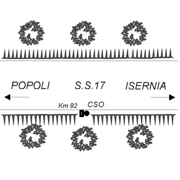 | Contrassegni | [{"simbolo_contrassegno":"P5","materializzazione":"(CSO) Pozzetto con base in mattoni contenente caposaldo di porcellana affogato in malta cementizia e protetto da tubo in pvc rivestito da calcestruzzo e coperto da chiusino in ghisa cementato alla base della pietra chilometrica K.92."}] |