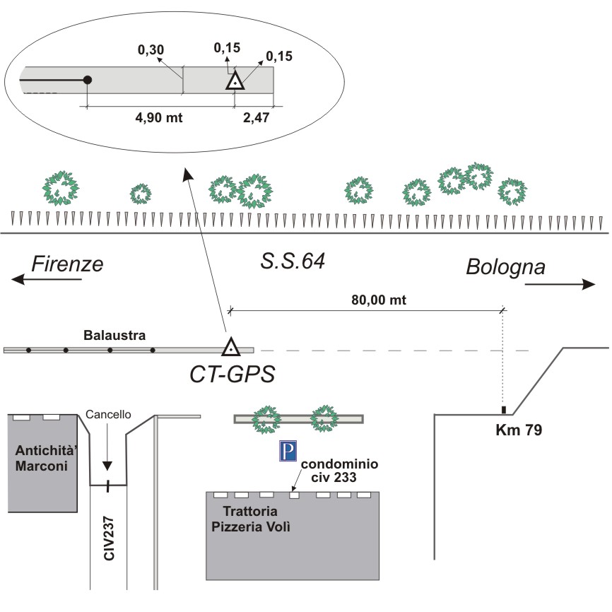 | materializzazione | Centrino in acciaio inox del tipo GPS da livellazione infisso sul cordolo in cemento armato a destra del parcheggio della pizzeria bar trattoria "Voli". |