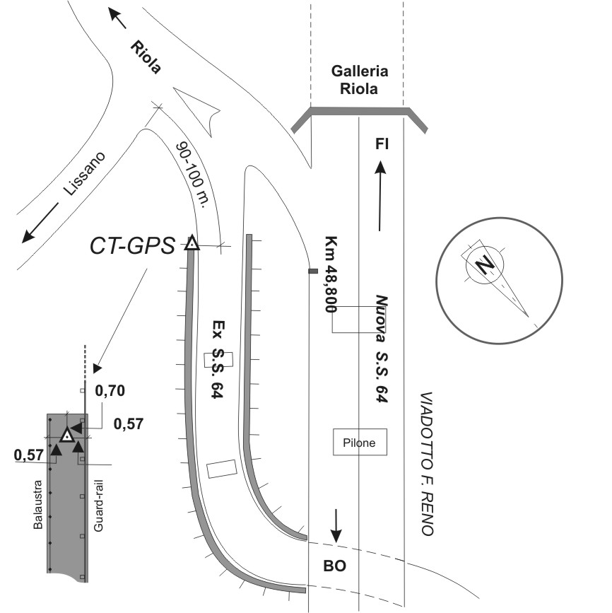 | Materializzazione | Centrino in acciaio inox del tipo GPS da livellazione infisso sulla sommità e all'estremità rivolta a Riola della spalla, lato valle, del viadotto di raccordo con la nuova strada statale 64. |