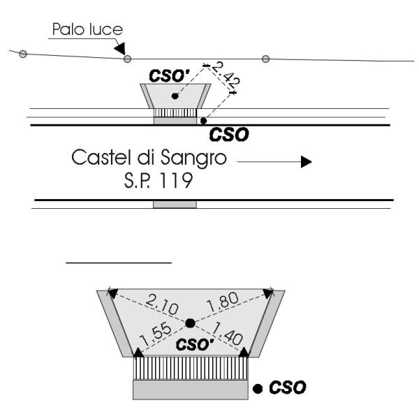 | Contrassegni | [{"simbolo_contrassegno":"P3","materializzazione":"(CSO) Pozzetto in ghisa ubicato alla testata del tombino lato monte."},{"simbolo_contrassegno":"B4","materializzazione":"(CSO')Chiodo GPS in acciao infisso al centro della soletta in c.a. prospiciente il tombino ove \u00e8 ubicato il CSO (CSO–>CSO' = 2.42 m.)"}] |