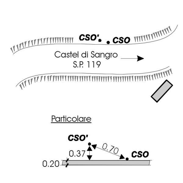 [{"simbolo_contrassegno":"B1","materializzazione":"(CSO) Bullone infisso sul cordolo facente parte della canala di raccoglimento delle acque a lato della strada."},{"simbolo_contrassegno":"B2","materializzazione":"(CSO') Chiodo inox infisso al centro della canala di raccoglimento delle acque, sito in corrispondenza del CSO (CSO–>CSO'= 0.70)"}]