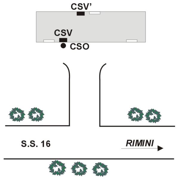 [{"simbolo_contrassegno":"P3","materializzazione":"(CSO) Chiusino in ghisa posto alla base della facciata verso la S.S. vicino allo spigolo sinistro."},{"simbolo_contrassegno":"V2","materializzazione":"(CSV) Piastrina a barilotto murata sulla stessa facciata in corrispondenza del CSO."},{"simbolo_contrassegno":"V2","materializzazione":"(CSV') Piastrina a barilotto murata al centro della facciata posteriore dell'ex stazione"}]
