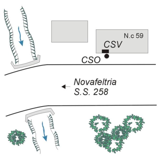 | Contrassegni | [{"simbolo_contrassegno":"P3","materializzazione":"(CSO) Pozzetto posto alla base della facciata, a sinistra della porta principale. \"A\" non misurabile."},{"simbolo_contrassegno":"V2","materializzazione":"(CSV) Piastrina in ghisa infissa sulla stessa facciata, in corrispondenza del CSO."}] |