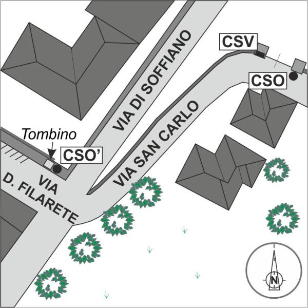 | Contrassegni | [{"simbolo_contrassegno":"B4","materializzazione":"(CSO') – Centrino in acciaio inox di tipo universale, infisso nel basamento in cemento di un tombino posto sul marciapiede all'incrocio tra via del Filarete e via di Soffiano."},{"simbolo_contrassegno":"B1","materializzazione":"(CSO) – Bullone infisso sulla colonna di destra del cancello in via San Carlo."},{"simbolo_contrassegno":"V3","materializzazione":"(CSV) – Piastrina antica infissa sulla colonna di sinistra del cancello situato in via di San Carlo."}] |