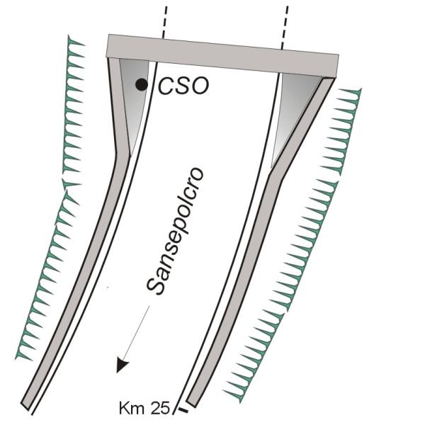 [{"simbolo_contrassegno":"B1","materializzazione":"(CSO) Bullone infisso sul muro laterale sinistro, prima dell'imbocco della galleria venendo da Sansepolcro."}]